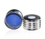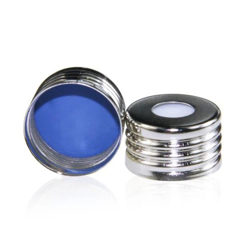 VC0653 VIAL CAP SCREW N18 SILVER OPEN TOP (8mm HOLE) WITH BLUE PTFE/WHITE SILICONE SEPTA (C0000208)